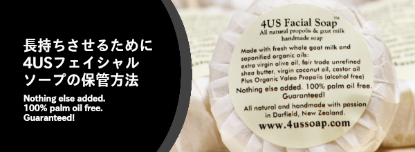 オーガニック石鹸『4USソープ』は、出来上がるまでに10週間という長い時間を要します。なぜかというと、短時間で大量に生産するために使用される、凝固剤を使っていないからです。そのため、たいへん水に溶けやすいのです。「水分に弱い(けど、そこが4US Soapならではの特徴だ)」と表現される方もいらっしゃいます。ですので、使い始めたら、毎回洗顔後に乾かせる場所に置いておくようにしてください。そうすれば、石鹸を長持ちさせることができます。